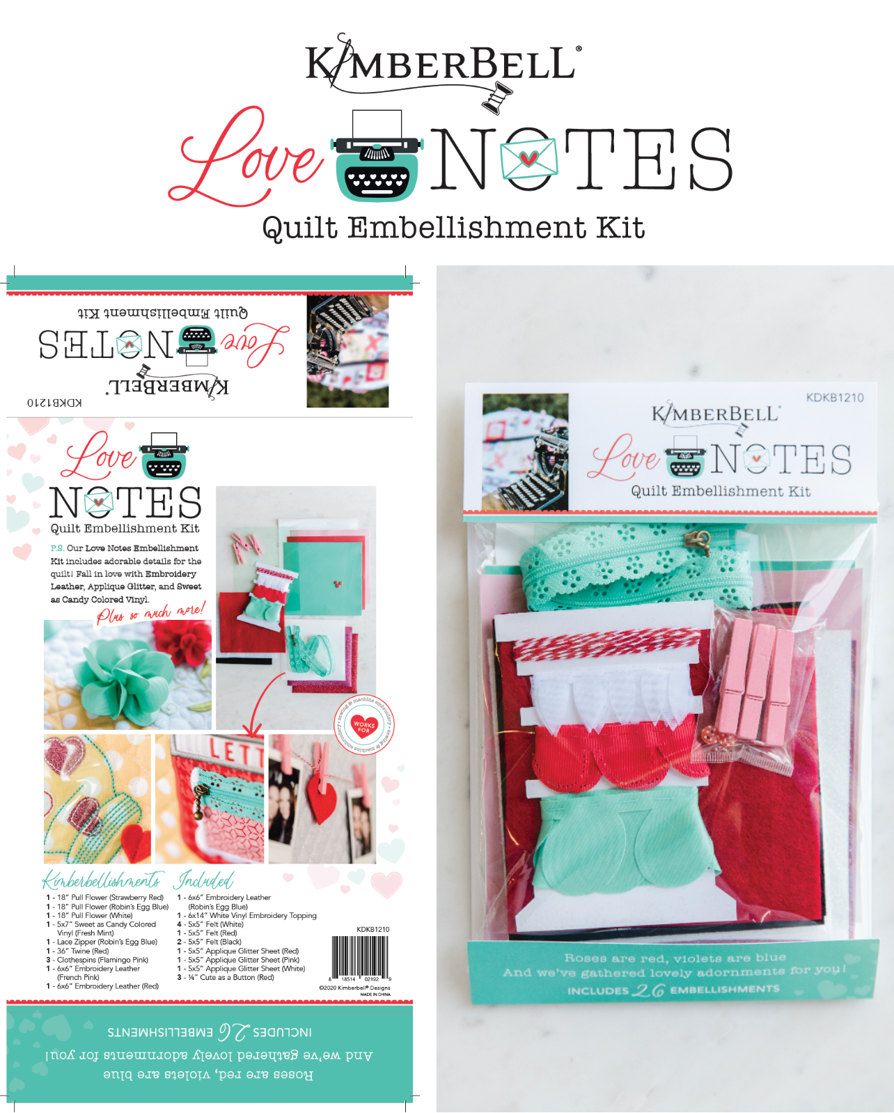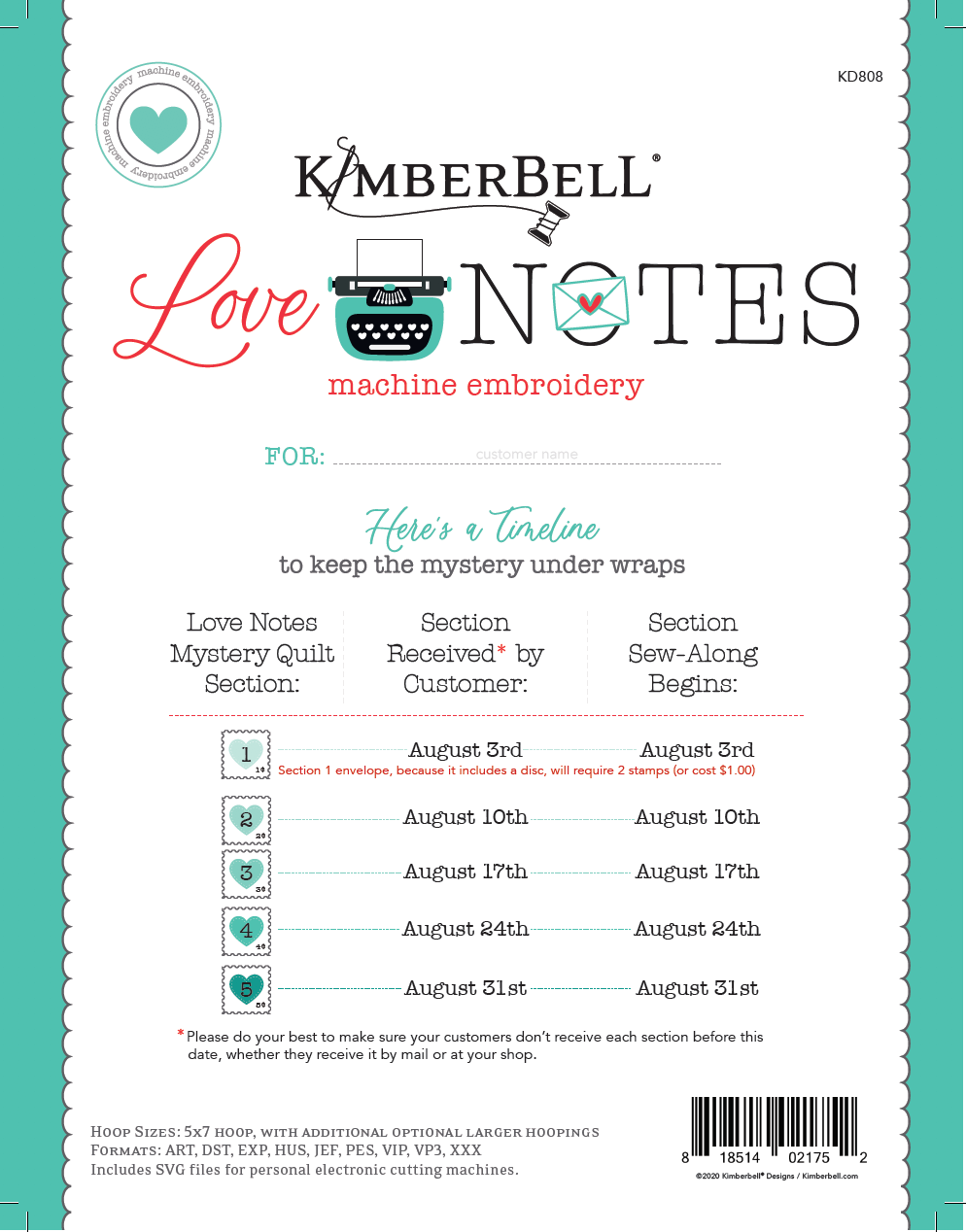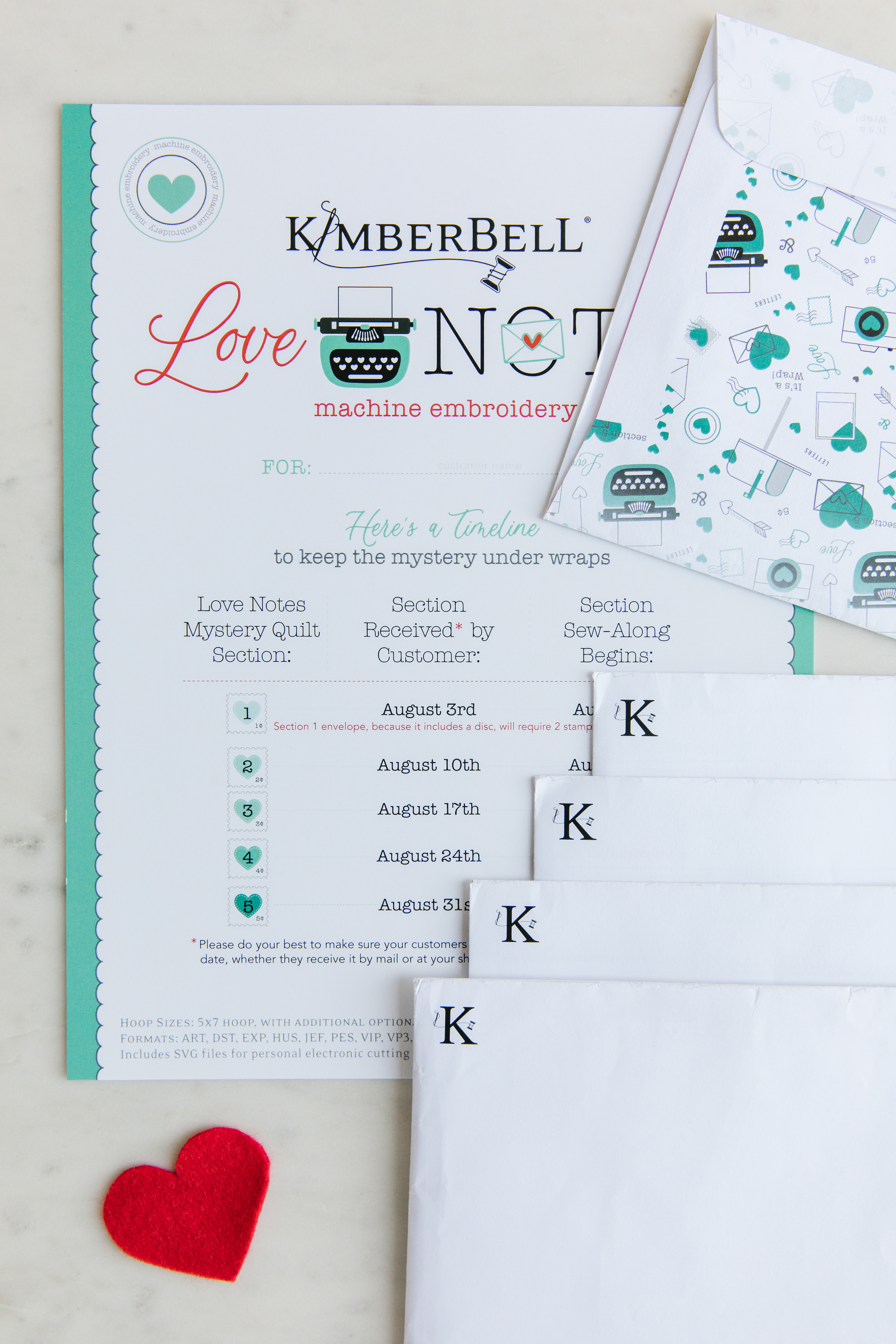 Designed in two formats, sewing and machine embroidery. The color red representing the sewing version and the aqua represents the machine embroidery version. Each week a customer will receive an envelope with a set of instructions inside. The envelope and instructions themselves are designed in an ombre effect to represent the step-by-step process as well. Marketing materials, packaging, and print collateral are designed with both red and aqua to represent both products as a whole. The design process itself started with deciding to add a gradient ombre effect and splitting the products themselves up by color for differentiation. Patterns were then created to use on envelope design and product instructions. Designing any collateral that needed to represent both products focuses strong on both colors.